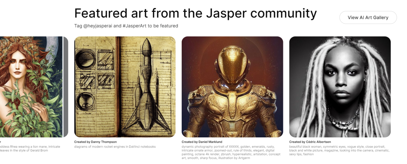 Jasper уже хорошо известен как инструмент для написания текстов с помощью искусственного интеллекта, который позволяет быстро и без особого вмешательства генерировать текст. Теперь Jasper может интегрировать сгенерированное ИИ искусство в вашу копию (или без использования Jasper для копирайтинга). Вы пишете подсказку и указываете стиль, средство, художника или стиль, настроение и любые конкретные ключевые слова, которые вы хотите включить — Jasper делает все остальное.