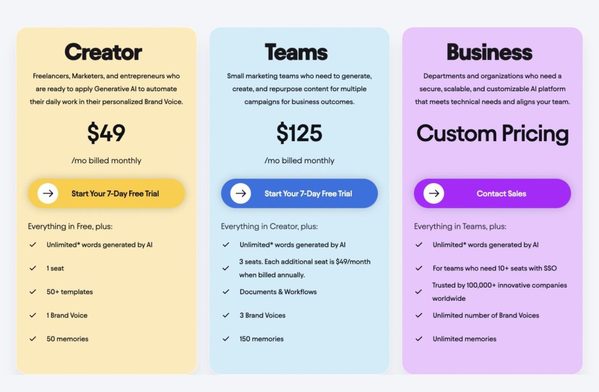 - Команды: $125/месяц с неограниченным количеством слов, 3 местами и 3 голосами бренда