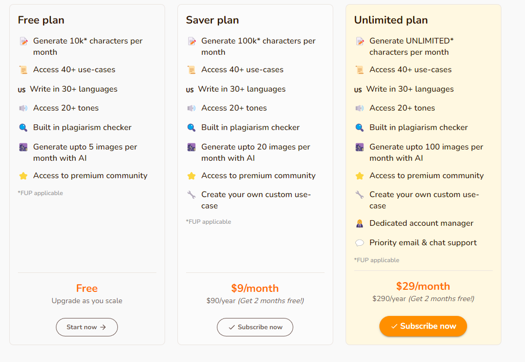 Бесплатный план включает пять изображений AI в месяц и более 10 000 знаков в месяц для объединения написания текста и создания изображений. Экономный план включает 20 изображений в месяц и более 100 000 символов в месяц. Неограниченный тарифный план включает до 100 изображений в месяц и не имеет ограничений по количеству символов в месяц. Этот тарифный план идеально подходит для создателей контента, которые пишут длинные по форме материалы или посты в блогах и хотят включить в них изображения, сгенерированные искусственным интеллектом.