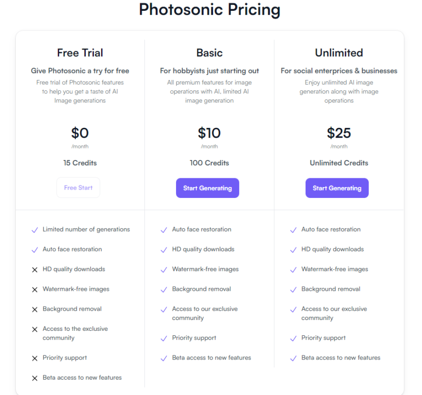 Бесплатный план Photosonic предлагает 15 кредитов в месяц и восстановление лица. Вы не сможете получить HD-изображения или изображения без водяного знака, поэтому если вы планируете использовать их где-либо, платный тарифный план будет полезен. Базовый тарифный план стоит $10 в месяц и дает вам 100 кредитов. Вы получаете изображения HD-качества, изображения без водяных знаков и бета-доступ к новым функциям. Этот тарифный план дает вам доступ к большей части программы.