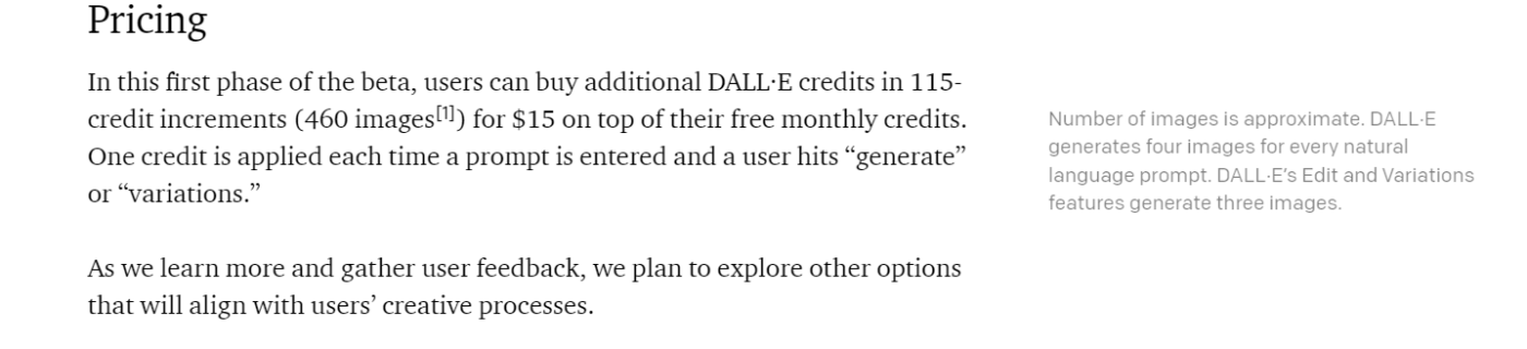 Когда вы начинаете использовать DALL-E 2, вы получаете 50 бесплатных «кредитов», которые в конечном итоге представляют собой изображения — вы можете приобрести еще 115 кредитов за раз (что составляет около 460 изображений) за $15 в дополнение к бесплатным 50 кредитам в месяц. Разбивка цен может показаться запутанной, и в зависимости от того, насколько сильно вы хотите использовать DALL-E 2 для создания искусственного интеллекта, вам может и не понадобиться больше 50 кредитов. По мере того, как OpenAI узнает больше о DALL-E 2 и о том, что нужно пользователям, они планируют пересмотреть модель ценообразования.