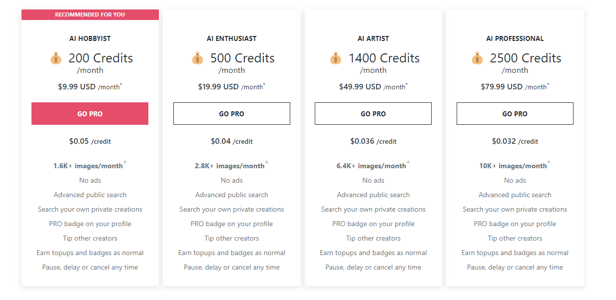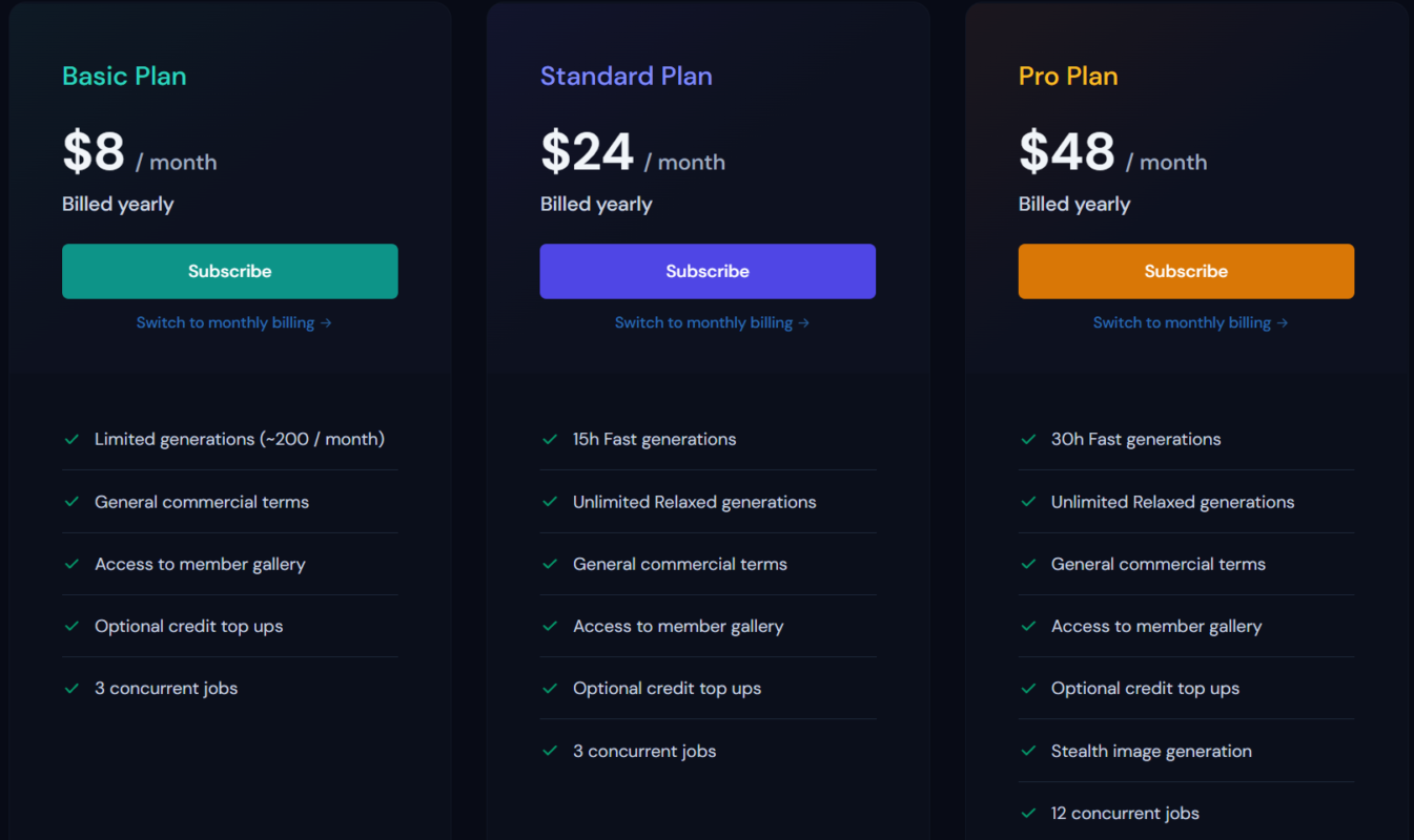 Про-план отлично подходит, если вы часто используете искусственный интеллект и вам нужно генерировать большое количество изображений. За $40/месяц вы можете использовать их в коммерческих целях и массово создавать изображения в любом художественном стиле.