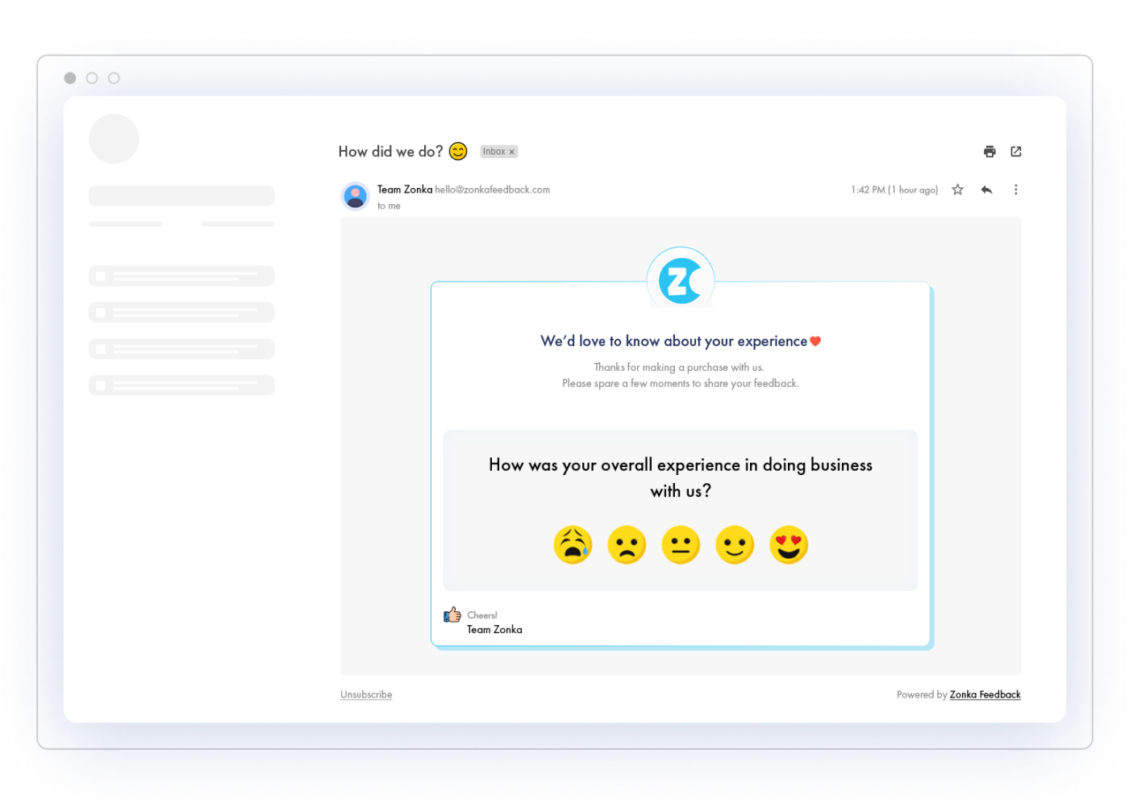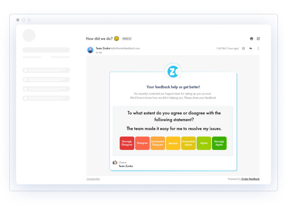 В компании Zonka мы используем опросы CSAT для улучшения процесса регистрации. Мы отправляем опрос CSAT каждый раз, когда клиент совершает покупку, и каждый раз, когда мы внедряем новую функцию или обновление программного обеспечения. Опросы после покупки помогают нам настраивать решения, поэтому клиенты могут видеть ощутимые результаты с самого начала. Мы вставляем опросы непосредственно в тело электронного письма, что повышает количество ответов.