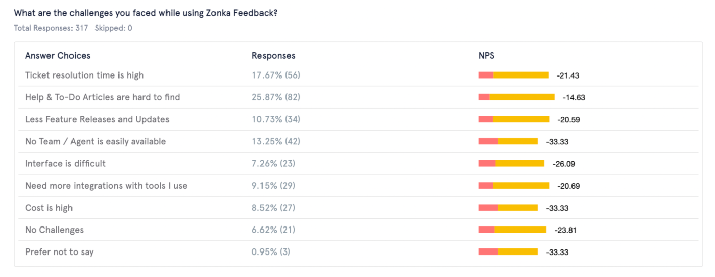 Чтобы понять причины, лежащие в основе оценки, мы добавили дополнительный вопрос, в котором спрашивали людей о проблемах, с которыми они столкнулись при использовании Zonka. Как вы можете видеть в приведенном выше отчете, пять основных причин, по которым наши недоброжелатели и пассивы назвали низкий NPS, были следующими: