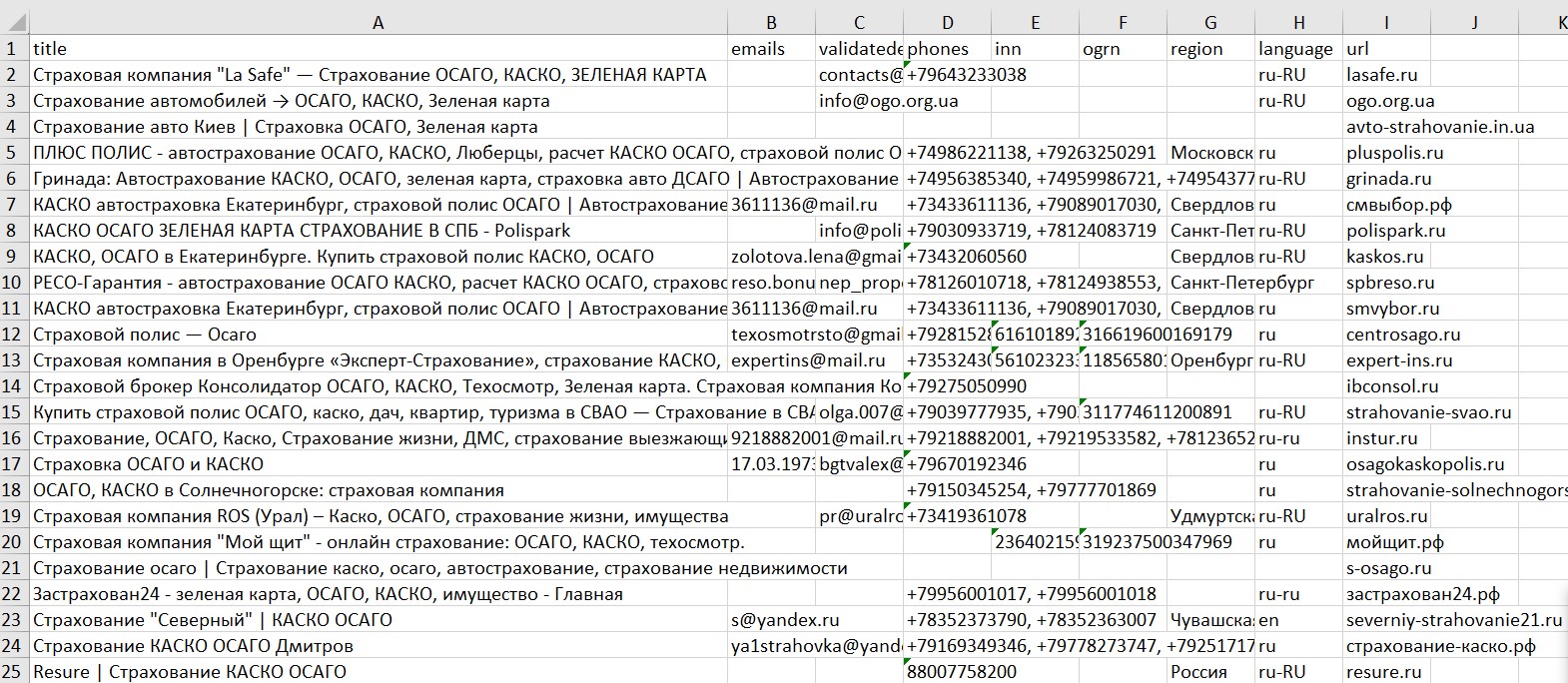 Наш сервис ищет в Интернете все сайты принадлежащие страховым агентств и вносит данные в базу. Скрипт анализирует вхождение стоп- и ключевых слов и сохраняет полученные данные в базу в формате Excel. Так мы получаем максимально точную тематическую выборку: