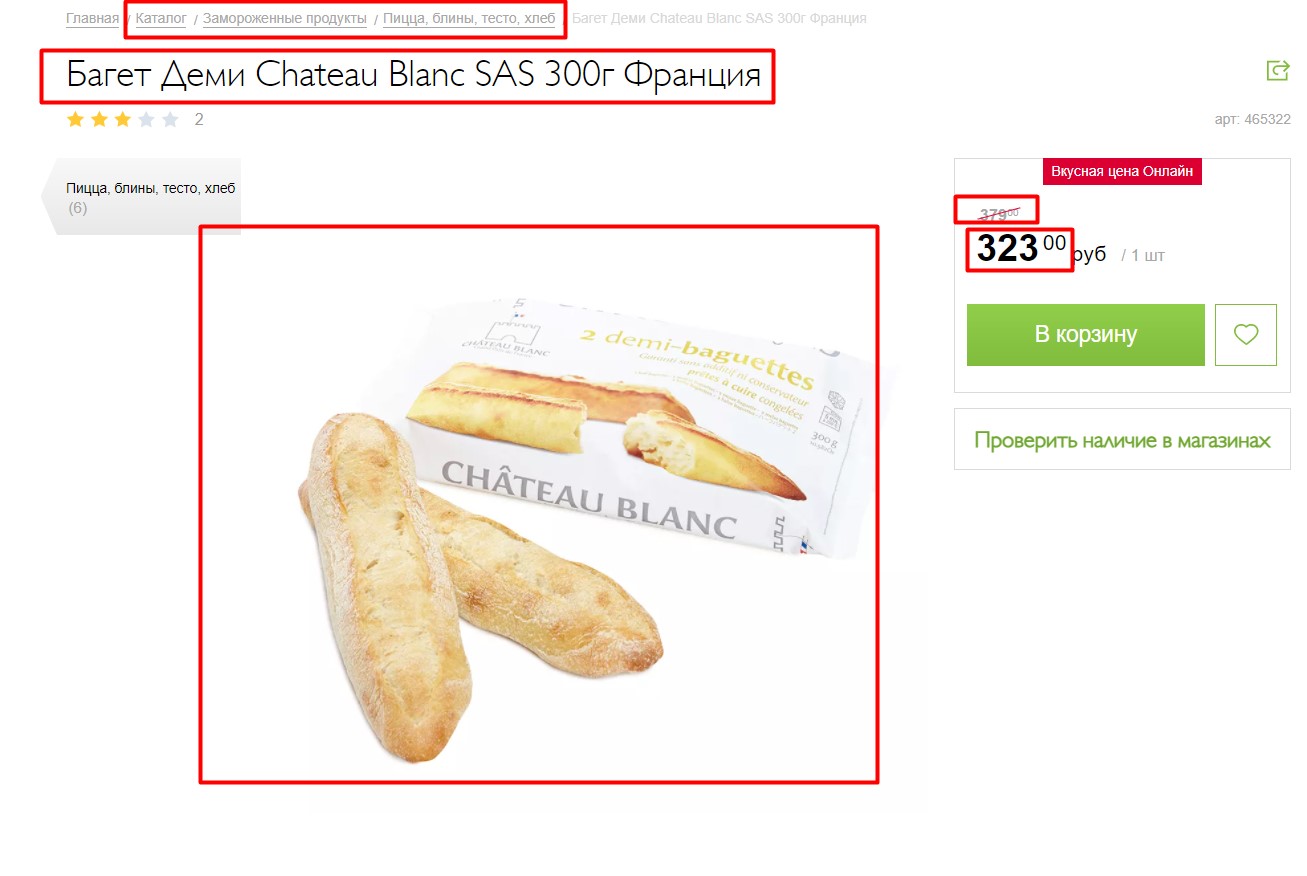 Как и в других компаниях, мы ежедневно парсим публичную (общедоступную) информацию с сайта, не защищаемую авторским правом (т.н. фактические данные). Например: название товара, категория, цены, артикул. Полученной информации достаточно для ежедневного ценового и товарного анализа. Учитывая популярность компании, анализ этих данных (мониторинг цен Азбука вкуса) позволит вам стать более конкурентным по цене, а анализ ассортимента – вводить максимально оборачиваемый товар в вашу матрицу. На изображении ниже выделены поля, которые мы собираем ежедневно.
