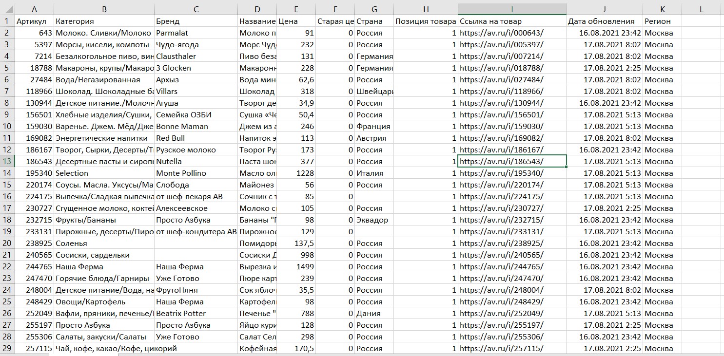 Вы можете прямо сейчас скачать результаты парсинга сайта «Азбука Вкуса». Информация в отчете актуальна на 17.08.2021