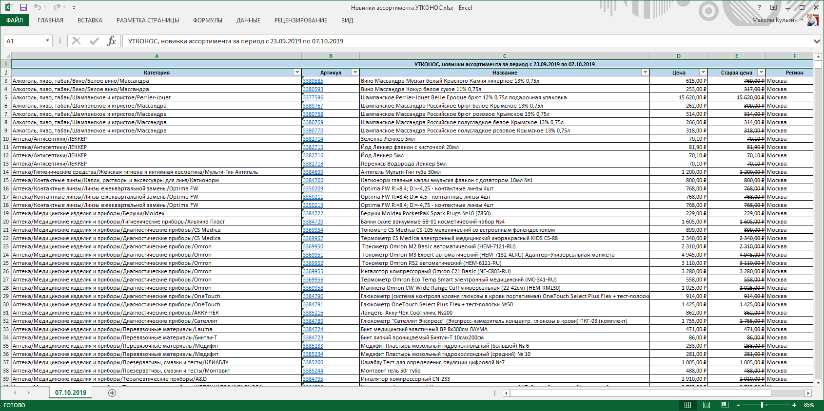 Вы можете прямо сейчас бесплатно скачать результаты парсинга. Нажмите кнопку «СКАЧАТЬ БЕСПЛАТНО» выше и вам на почту придет пример данных. Помимо всего ассортимента, мы отслеживаем и ежедневно публикуем новинки товаров за последние 14 дней и действующие акции на товары (товары по акции). Для регулярной работы с данными мы предоставим доступ к нашему защищенному облаку, где на ежедневной основе публикуются результаты парсинга «УТКОНОС».