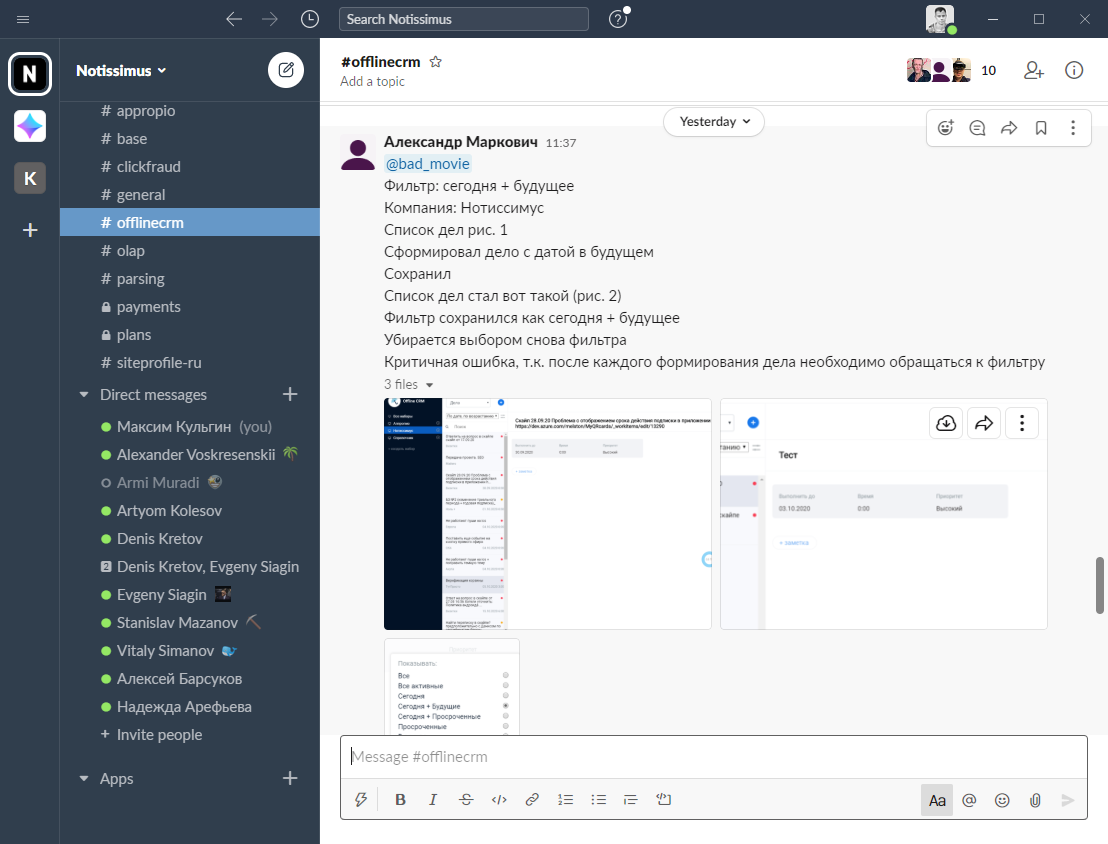 Вот так ребята пишут (см. ниже картинку) когда находят баги в CRM — просто в Slack. Затем разработчик переносит это в Phabricator. Такой способ позволяет очень быстро зафиксировать ошибку, “на лету”, можно сказать — ребята работают в CRM , что-то не понравилось, тут же короткая заметка в Slack и дальше работают. Советую..