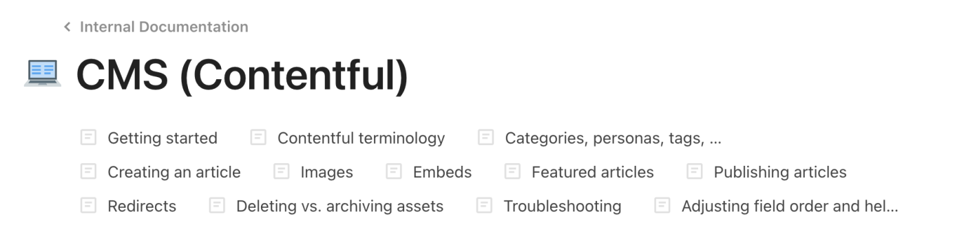 В документации нашей команды мы разбиваем каждую тему на разделы, чтобы было легко ориентироваться, но каждый раздел настолько короткий и понятный, что любой может научиться пользоваться нашей CMS. Любая абстрактная информация о том, что мы публикуем и почему, хранится в уставе нашей команды, чтобы избежать путаницы.