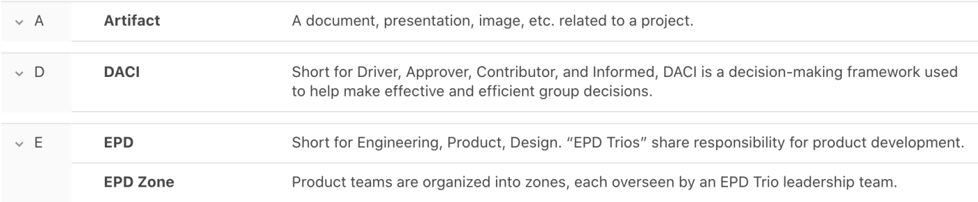 Будь то учебные материалы, руководства для сотрудников или стандартные операционные процедуры, изложение всего в нескучной форме поможет новым членам команды быстрее войти в курс дела. Например, член команды начального уровня, только что пришедший в отдел маркетинга, не обязательно будет знать, что означает MAU или что означает «анализ критических KPI с точки зрения показателя отказов». Когнитивный психолог и лингвист Стивен Пинкер называет это явление «проклятием знания». Он придумал этот термин для описания того, что происходит, когда эксперты переоценивают уровень знаний неспециалистов. Мы склонны предполагать, что знаем слишком много, не предоставляем достаточного контекста и не даем определения аббревиатурам или жаргонам, которые считаем само собой разумеющимися. Итак: предположите, что читатель легко поймет рассматриваемое понятие, но потратьте время на то, чтобы объяснить ему его так, как будто он никогда о нем не слышал. Например, глоссарий, который мы используем в Zapier.