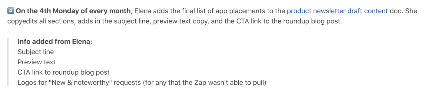 Если ваши внутренние документы настолько запутанны, что вы мучительно подробно описываете каждый отдельный процесс и концепцию в рамках этого процесса, вам и вашим читателям придется несладко. (Если только это не чемпионка по скорочтению Энн Джонс, которая может читать 4200 слов в минуту. В таком случае, можно мне получить вступление?) Вы также будете испытывать трудности, когда что-то неизбежно изменится, и вам нужно будет обновить документы в соответствии с этим. Скажем, например, ваша команда переводит весь поток вебинаров на новый маркетинговый инструмент, чтобы лучше отслеживать участников и заполнение форм в одном месте. Представьте себе, что вам придется просмотреть 120 страниц документации, чтобы найти и искоренить любое упоминание о том, как вы раньше управляли вебинарами. Для всеобъемлющих процессов лучше сократить текст до удобоваримого формата, с достаточным количеством деталей, чтобы он был понятен, но не настолько глубоким, чтобы любое крошечное изменение в процессе делало весь процесс неактуальным. Например, в компании Zapier я помогаю вести ежемесячный информационный бюллетень о продукте, и мне помогает простое изложение каждого этапа этого процесса.