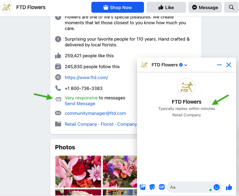 В приведенном выше примере флорист отвечает потенциальному клиенту, оперативно предоставляя решение его проблемы. Это и обслуживание клиентов, и маркетинг в одном лице, что гораздо более естественно на платформе социальных сетей, чем на платформе обслуживания клиентов. А когда ответ быстрый, это больше похоже на разговор с другом по СМС, а не с компанией, которая может потратить 24 часа на ответ по электронной почте. Существует значок «Очень быстро реагирует на сообщения», который вы можете получить от Facebook и который будет отображаться в разделе «О компании» на вашей странице Facebook. Он требует, чтобы вы отвечали на 90% всех запросов в течение 15 минут.