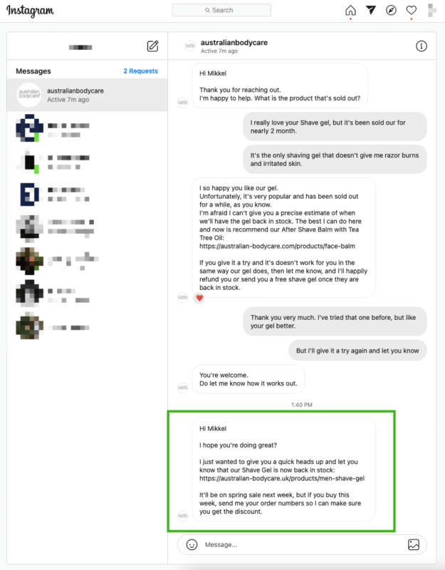 Вы хотите постоянно держать своих клиентов в курсе событий. Речь идет о каждом запуске продукта, каждом объявлении компании и каждом обновлении отгрузки — помимо всего прочего. Прозрачность, которая возникает при обмене информацией о компании, позволяет вам чувствовать себя брендом, заслуживающим доверия. Это не обязательно должно быть что-то грандиозное — достаточно простого личного сообщения. Вот пример сообщения, которое я получил от бренда на Instagram (который теперь интегрирован с Messenger) и которое мне понравилось.