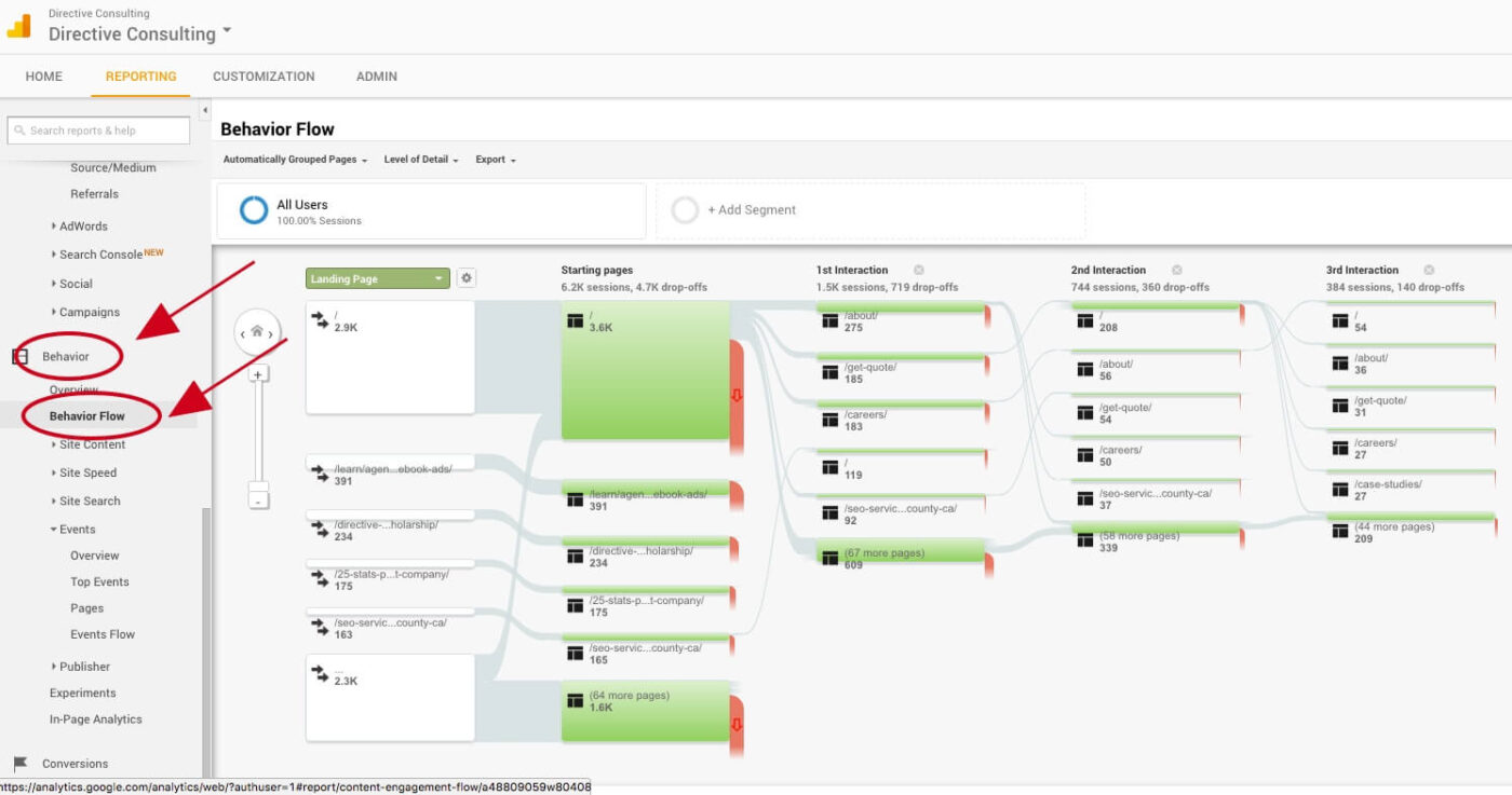 В Google Analytics есть множество различных инструментов, которые помогают отслеживать пути конверсии. Для начала вы можете посмотреть на «Потоки поведения», чтобы определить различные точки соприкосновения на пути конверсии пользователя (или «Путешествие покупателя» для электронной коммерции).