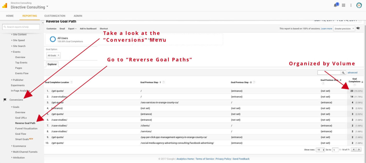2017 год станет годом, когда все поймут, что эффективная оптимизация означает распределение времени, энергии и расходов на наиболее прибыльные активы и кампании. Именно поэтому лучшие специалисты по созданию ссылок не просто накапливают большие списки обратных ссылок. Они отдают предпочтение наиболее ценным «денежным» служебным страницам и направляют свои обратные ссылки в этом направлении, а не только на главную страницу. Это потому, что именно эти страницы обеспечивают конверсию и доход. А значит, именно сюда они хотят направить трафик. Накапливать трафик не так уж плохо, если речь идет о трафике и конверсии. То же самое касается оптимизации путей конверсии и пользовательского опыта. Хотя, возможно, было бы неплохо улучшить пользовательский опыт для каждого пользователя и каждого лида, который проходит через ваш домен, это не принесет вам денег. Вместо этого сосредоточьте свои усилия и средства на воспроизведении наиболее успешного пользовательского опыта, который привел к наибольшему количеству конверсий. Вот три легко реализуемые метрики отслеживания Google Analytics, которые помогут вам оптимизировать идеальный путь конверсии.