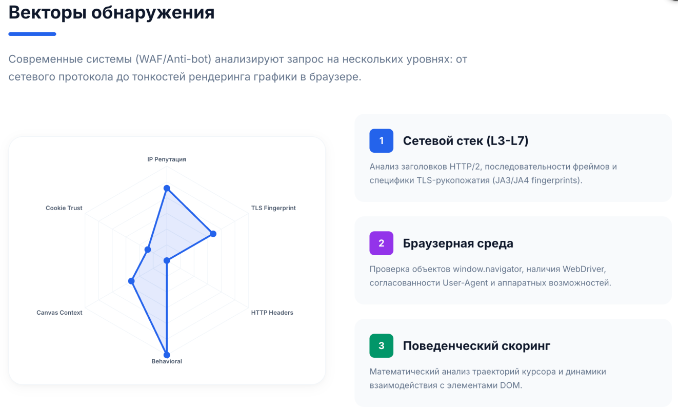 Системы защиты теперь работают на разных уровнях. На сетевом уровне они проверяют параметры шифрования. На уровне браузера они выполняют невидимые скрипты для сбора характеристик устройства. На уровне поведения они следят за тем, как быстро человек перемещается по страницам и как он взаимодействует с интерфейсом.3 Такая многослойная преграда делает обычные скрипты на базе стандартных библиотек бесполезными.