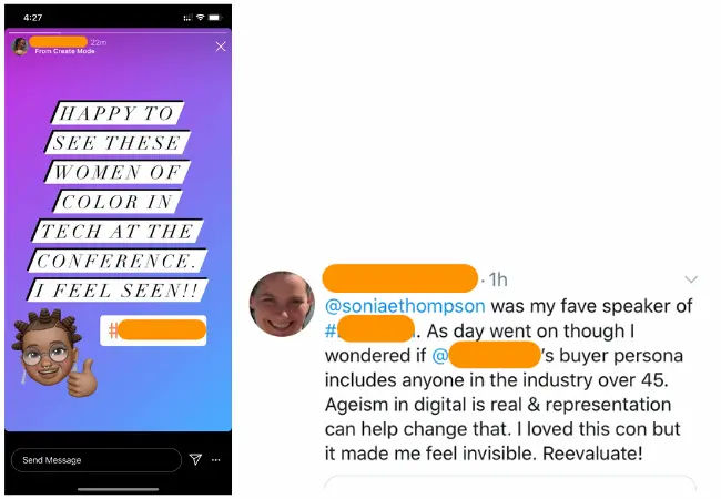 Никто не хочет чувствовать себя невидимым, но, к сожалению, люди из маргинальных сообществ часто чувствуют себя проигнорированными брендами, которые концентрируют все свое внимание на тех, кто является частью «мейнстрима». Вот почему люди, которых часто игнорируют, так радуются, когда бренд уделяет время тому, чтобы «увидеть их». Пару лет назад я был ведущим на одной конференции. После этого я увидел в социальных сетях комментарии слушателей, которые говорили о том, какие чувства вызвал у них состав докладчиков на конференции. Вот один из примеров, когда участница почувствовала себя «замеченной», потому что ей понравилось, что докладчики конференции представляли таких же цветных женщин, как она. А в другом примере участница почувствовала себя невидимкой, потому что не увидела ни одного выступающего из своей возрастной группы.