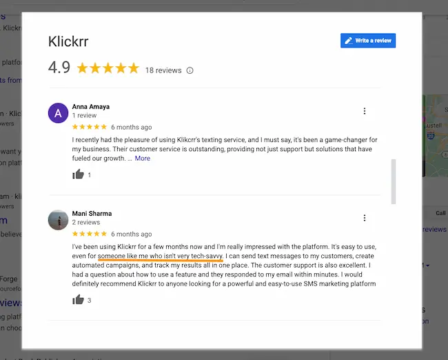 Чтобы задействовать эту всеохватывающую SEO-стратегию, создайте бизнес-профиль Google и добавьте атрибуты, которые имеют смысл для вашего бренда, исходя из того, каких клиентов вы обслуживаете. По ссылке ниже я опубликовал эпизод подкаста о том, как оптимизировать свой профиль для нескольких языков и групп идентичности. Реальные клиенты также могут оставлять отзывы (и вы можете поощрять их к этому) о вашем бизнесе, рассказывая о своем опыте. Когда потенциальные клиенты видят на вашем профиле неафишируемые отзывы от таких же людей, как они, это придает им уверенность, необходимую для того, чтобы сделать следующий шаг вперед с вами. На изображении ниже — компания Klickrr, специализирующаяся на текстовом маркетинге и размещающая отзывы клиентов в своем бизнес-профиле Google.