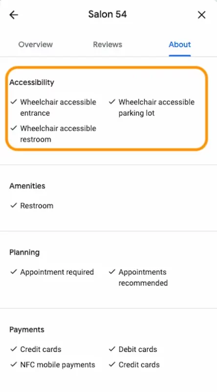 Салон 54, изображенный на фото ниже, также отлично справляется с этой задачей, предоставляя ключевую информацию о доступности, чтобы все посетители понимали, какие возможности у них есть.
