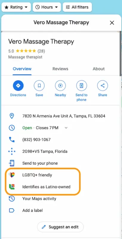Однажды мой муж задал в Google запрос «peluqueria» (так по-испански называется парикмахерская) и не получил ни одного местного результата. Когда я задала запрос «парикмахерская», то получила результат о месте, расположенном менее чем в 50 футах от того места, где мы стояли. Простые изменения в бизнес-профиле Google помогли бы этому предприятию отобразиться для моего мужа при поиске на испанском языке. Vero Massage Therapy — отличный пример оптимизированного бизнес-профиля Google, поскольку он дает понять представителям ЛГБТК+ и латиноамериканского сообщества, что в спа-салоне им всегда рады.