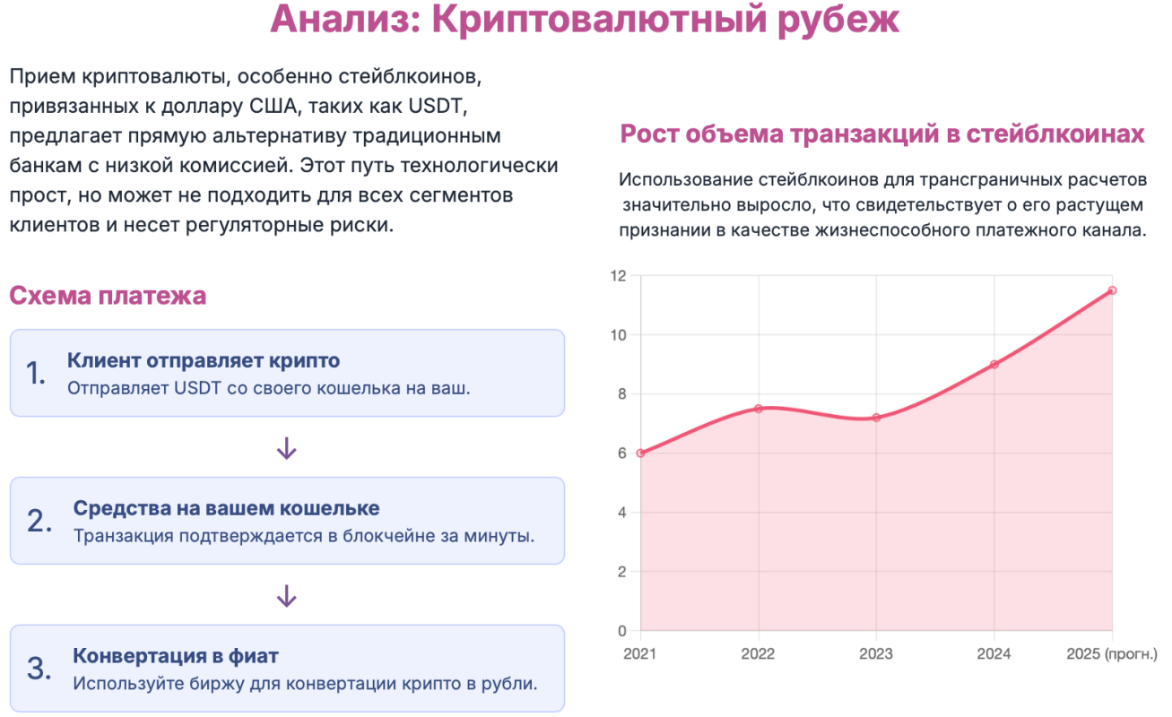 Несмотря на запрет, существует легальная схема работы, которая строится на использовании специализированных сервисов — криптопроцессингов. Эти сервисы выступают в роли посредника и, что самое важное, юридического «буфера» между клиентом, платящим в криптовалюте, и российской компанией, которая должна получить выручку в рублях.