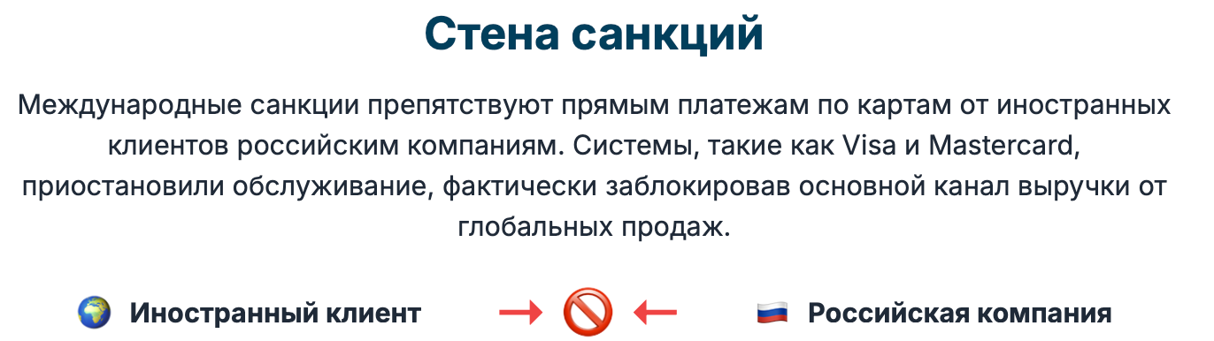 Во-вторых, большинство крупных международных платежных шлюзов, которые являются технологическими посредниками для обработки онлайн-платежей, прекратили работу с компаниями, зарегистрированными в РФ. Сервисы Stripe, PayPal, Braintree и 2Checkout (Verifone), которые были отраслевым стандартом для SaaS, закрыли регистрацию и обслуживание для российских клиентов.1 Это сделало практически невозможным для юридического лица из России легально и технически грамотно организовать прием платежей от иностранной аудитории.