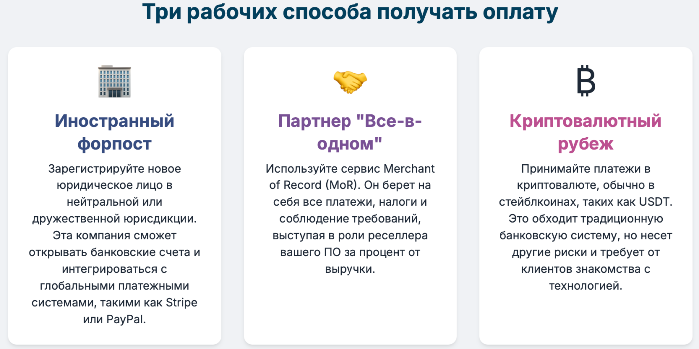 Проблема заключается не в том, чтобы разово получить деньги, а в том, чтобы выстроить масштабируемую и автоматизированную систему биллинга для сотен или тысяч клиентов по всему миру. Решить эту задачу, оставаясь в рамках российской юрисдикции, на данный момент невозможно.