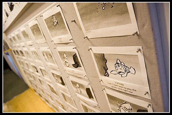 Раскадровка — это серия эскизов, представляющих собой отдельные кадры, запланированные для видеоролика, фильма или рекламного ролика. Они часто включают указания по ракурсу, освещению и переходам, а также диалоги и другие примечания. Как все хорошие писатели начинают свои статьи с набросков, так и хорошие маркетологи начинают свои видеоролики с раскадровок. Вы наверняка видели, как они используются в анимационных фильмах. Джон Лассетер, главный креативный директор компании Pixar, называет их «комиксовой версией истории». Вот несколько раскадровок, использованных его командой при создании фильма «В поисках Немо»: