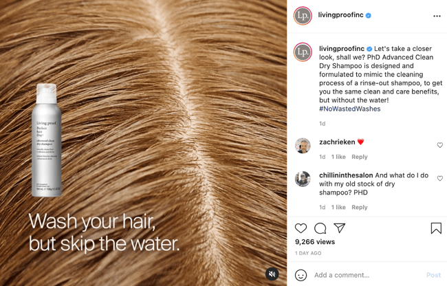 Сосредоточившись на том, как продукт принесет пользу потребителям, рассказывая о нем, и используя новый хэштег #NoWastedWash, Living Proof создает ажиотаж и спрос на свой новый продукт.
