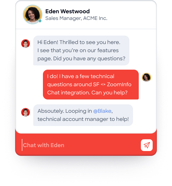 Чат ZoomInfo-это инструмент чата на базе данных, разработанный для квалификации и подготовки посетителей вашего сайта к следующему шагу, направления более квалифицированных потенциальных клиентов в вашу команду продаж и ускорения процесса продаж, согласно чату ZoomInfo. Его платформа позволяет специалистам по продажам и маркетингу выявлять, устанавливать связи и взаимодействовать с квалифицированными потенциальными клиентами. В нем также есть приложение для чата в реальном времени.