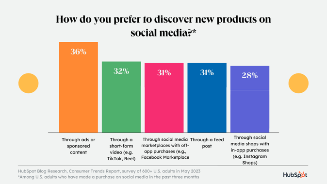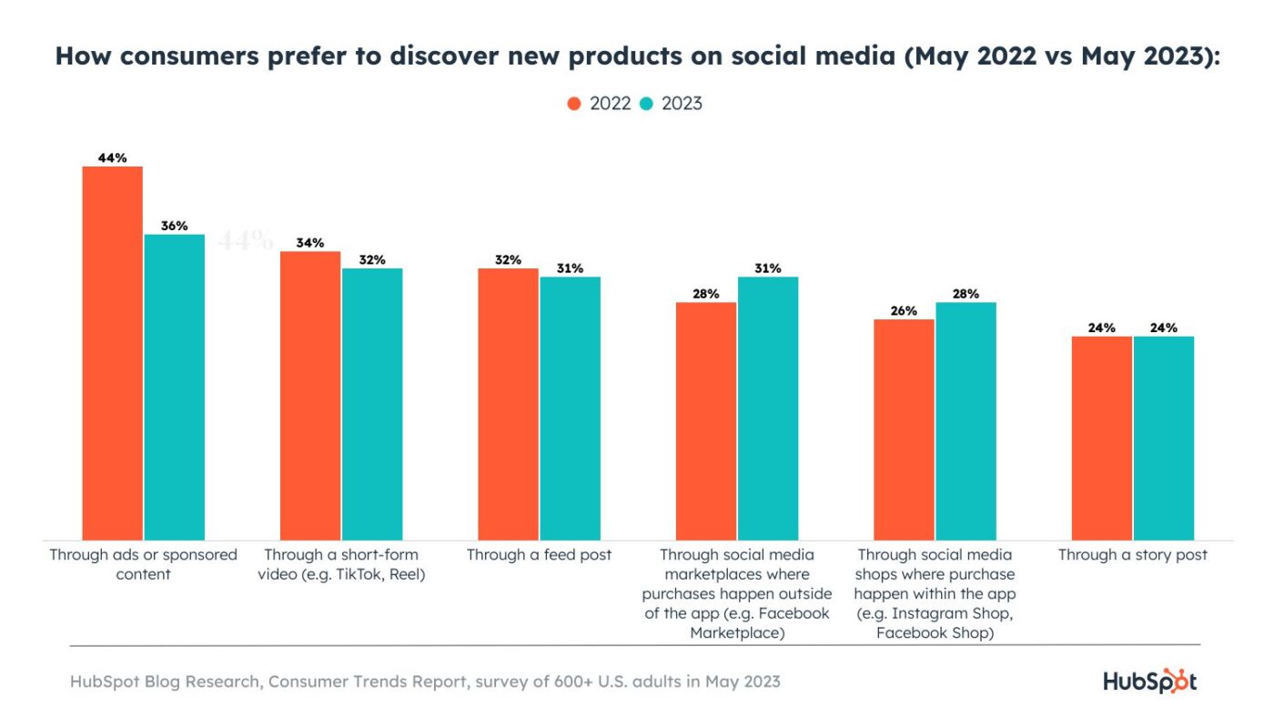 Потребители предпочитают узнавать о товарах в социальных сетях через рекламу или спонсорский контент, короткие видеоролики, а также через посты в ленте и маркетплейсы социальных сетей, а покупки вне приложений занимают третье место. Предпочтение рекламы или спонсорского контента остается неизменным по сравнению с 2022 годом, но есть два заметных изменения по сравнению с прошлым годом. Потребители в 2023 году больше предпочитают короткие видеоролики (+23 % по сравнению с предыдущим годом), а маркетинг влияния увеличился на +15 % по сравнению с предыдущим годом.