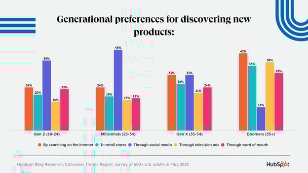 Хотя реклама на потоковых сервисах и маркетинговые электронные письма менее популярны среди всех поколений вместе взятых, разделение данных по возрастным группам рисует иную картину. Представители поколений Z, Millennials и Gen X отличаются от Boomers тем, что предпочитают узнавать о продуктах через социальные сети, а Boomers предпочитают искать информацию в Интернете. Представители поколения Z и бумеры сходятся в том, что предпочитают узнавать о продуктах из уст в уста.