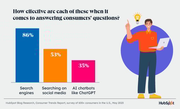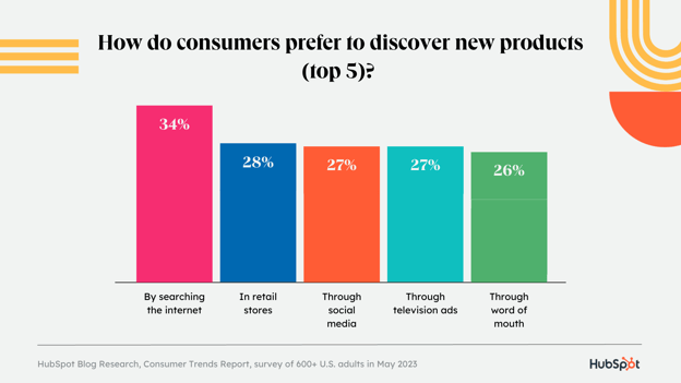 34 % потребителей предпочитают узнавать о товарах через поиск в Интернете, что подчеркивает важность оптимизации вашего сайта для SEO. Он популярен среди всех возрастных групп, но из-за разницы поколений наиболее популярен среди представителей поколения X и бумеров. Однако это не означает, что поисковые системы умирают. По мнению потребителей, поисковые системы по-прежнему остаются лучшим способом получения информации.