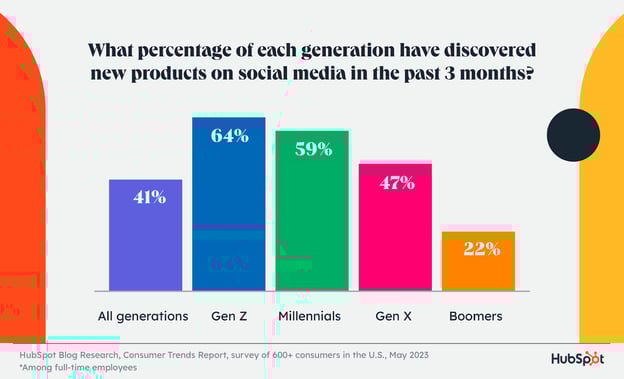 За последние три месяца 41 % потребителей открыли для себя товар в социальных сетях. Если разделить эти данные по возрастным группам, то 64 % представителей поколения Z за последние три месяца открывали для себя товары в социальных сетях.