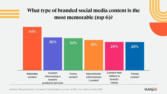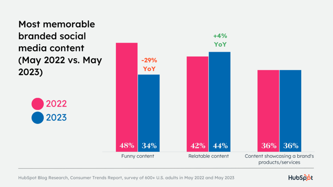 44 % потребителей утверждают, что наиболее запоминающимся является контент, основанный на достоверной информации, за ним следует контент, демонстрирующий продукты/услуги бренда (демо-версии, тизеры и т. д.), а затем смешной контент. В 2022 году тройка предпочтений осталась прежней, но заняла другие места. Смешной контент был самым запоминающимся, но его популярность снизилась на -29 % по сравнению с прошлым годом. Относительный контент занял первое место, изменившись на +4,7 % по сравнению с прошлым годом.