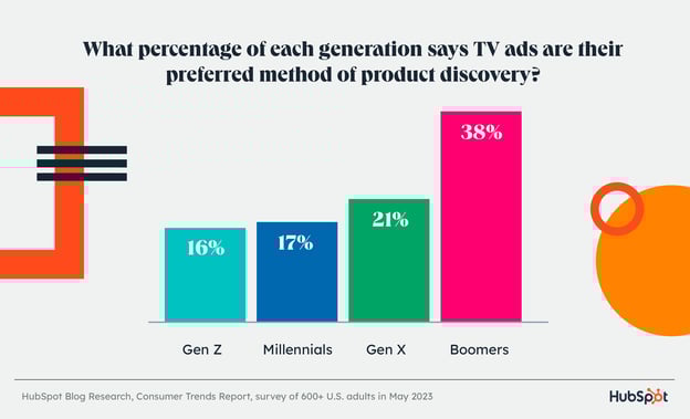 Телевизионная реклама играет ключевую роль для бэби-бумеров, и это второй предпочтительный способ знакомства с новыми продуктами. Однако для всех остальных поколений этот канал не подходит.