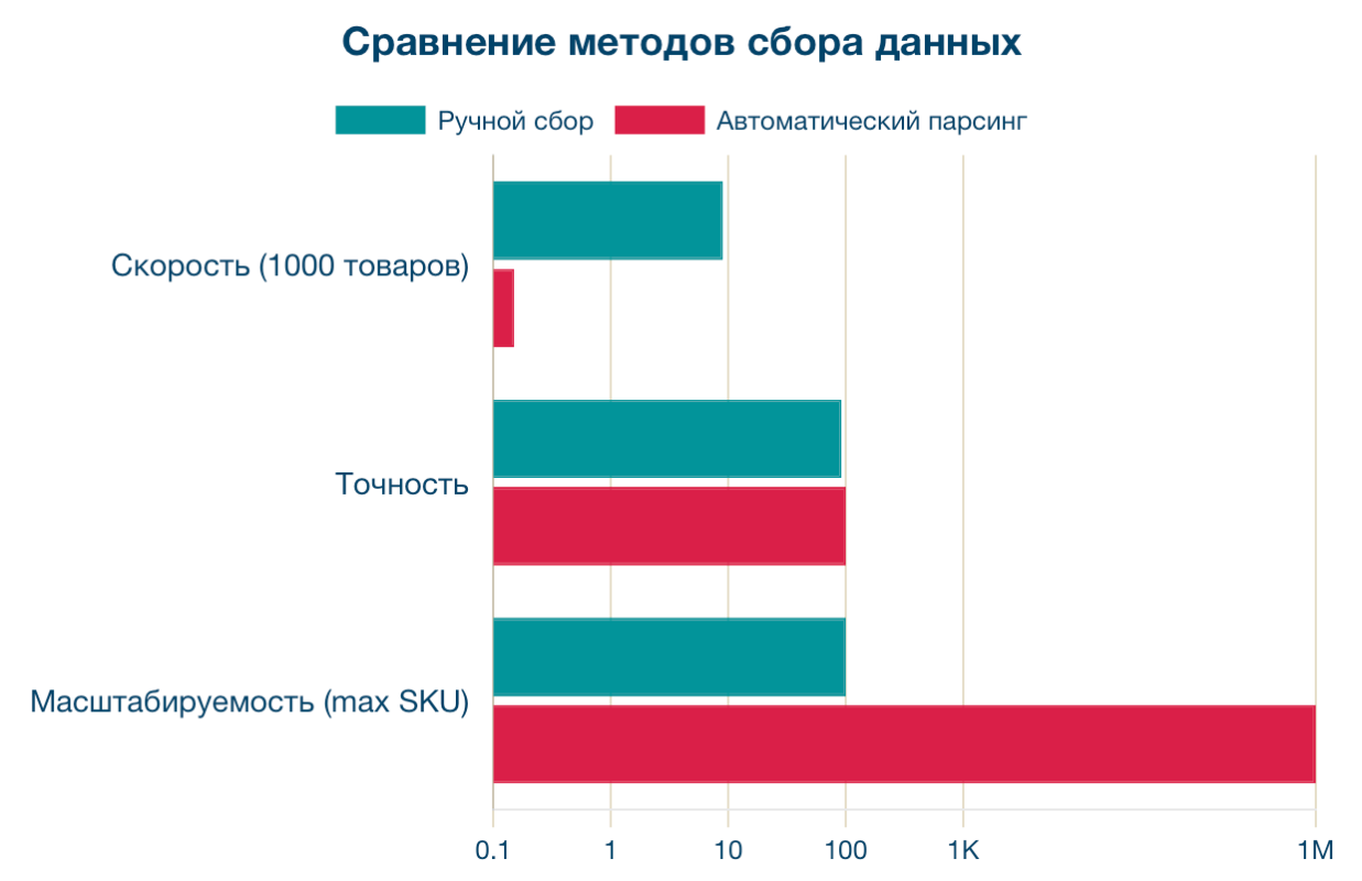 Когда речь идет о небольшом бизнесе с ассортиментом в 20-30 позиций и одним-двумя конкурентами, ручной сбор данных может показаться приемлемым вариантом.1 Однако как только масштаб задачи хоть немного увеличивается, его недостатки становятся критическими. Автоматизация процесса с помощью парсинга дает бизнесу неоспоримые преимущества.