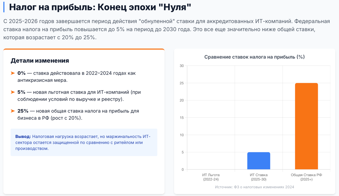 Налог на прибыль — это тот индикатор, который четко показывает разделение бизнеса на «приоритетный» и «обычный». Если раньше разница была между 0% (ИТ) и 20% (обычный бизнес), то теперь ставки повышаются для всех, но с разной скоростью.