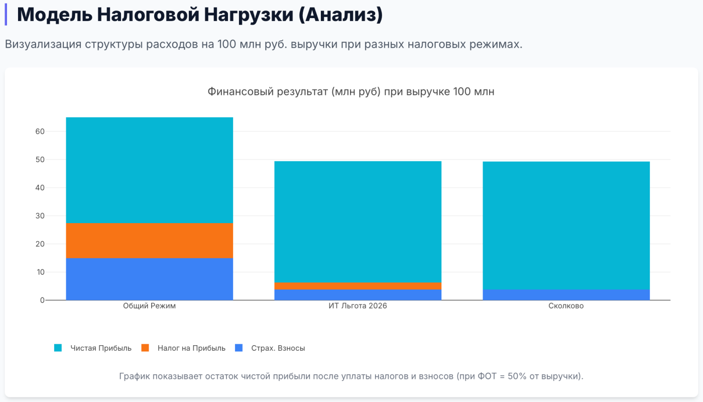 Разница между «обычным ИТ» и «Сколково» составляет около 4 млн рублей в пользу Сколково (за счет 0% на прибыль), даже несмотря на более высокие взносы. Но разница между «ИТ» и «Потерей статуса» — колоссальна (33 млн против 88 млн). Нагрузка вырастает почти в 3 раза. Это доказывает, что в 2026 году сохранение статуса ИТ-компании — вопрос жизни и смерти бизнеса.