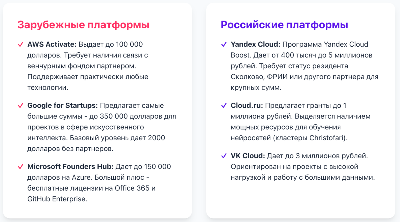 | vk cloud | до 2 000 000 руб. | 6 месяцев | бесплатная офисная почта, скидки на продвижение продукта в социальных сетях 50 |