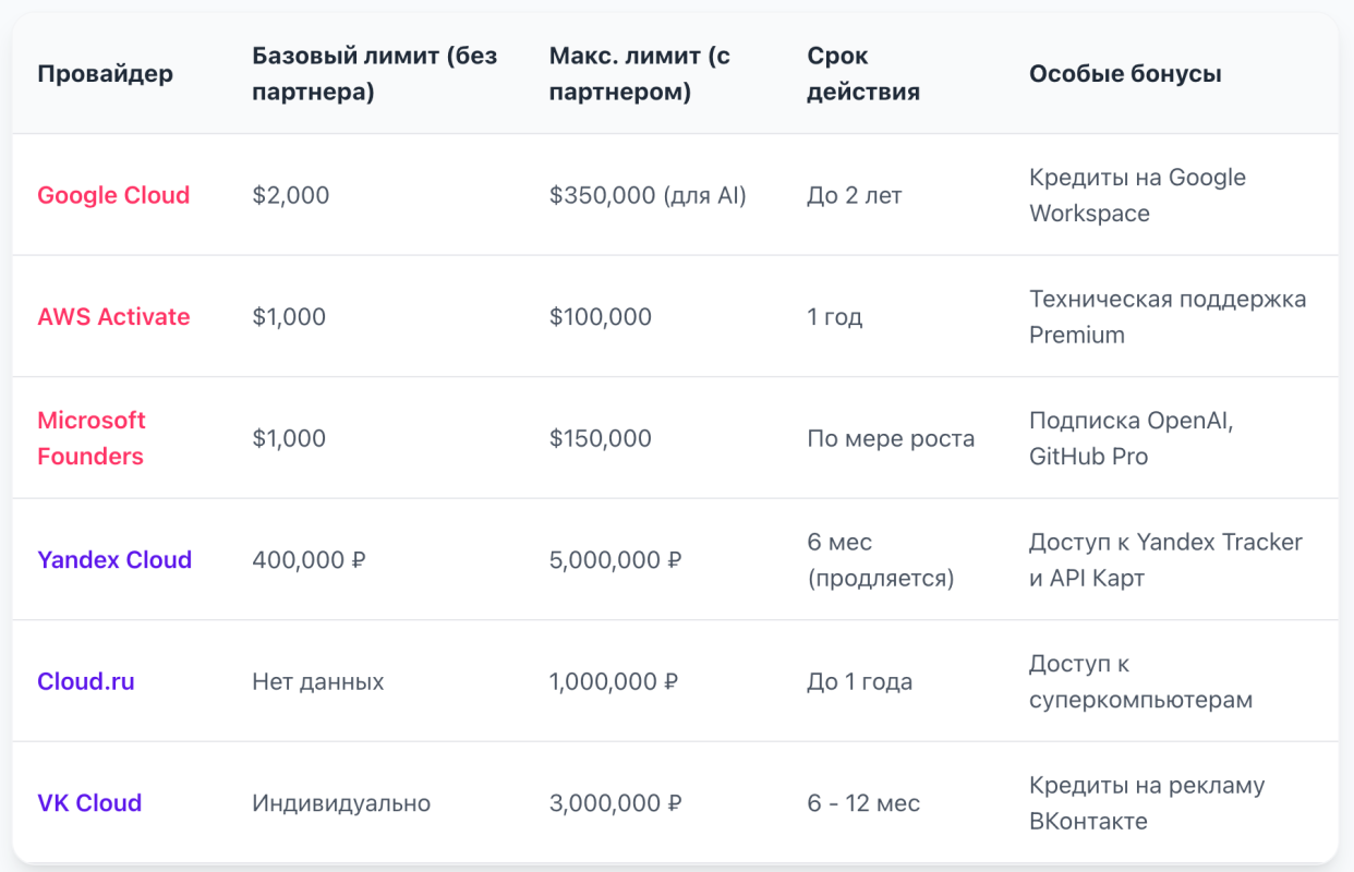 | aws activate | до $100 000 | 1-2 года | универсальные архитектуры, требуется связь с партнерами для выдачи крупных сумм 1 |
