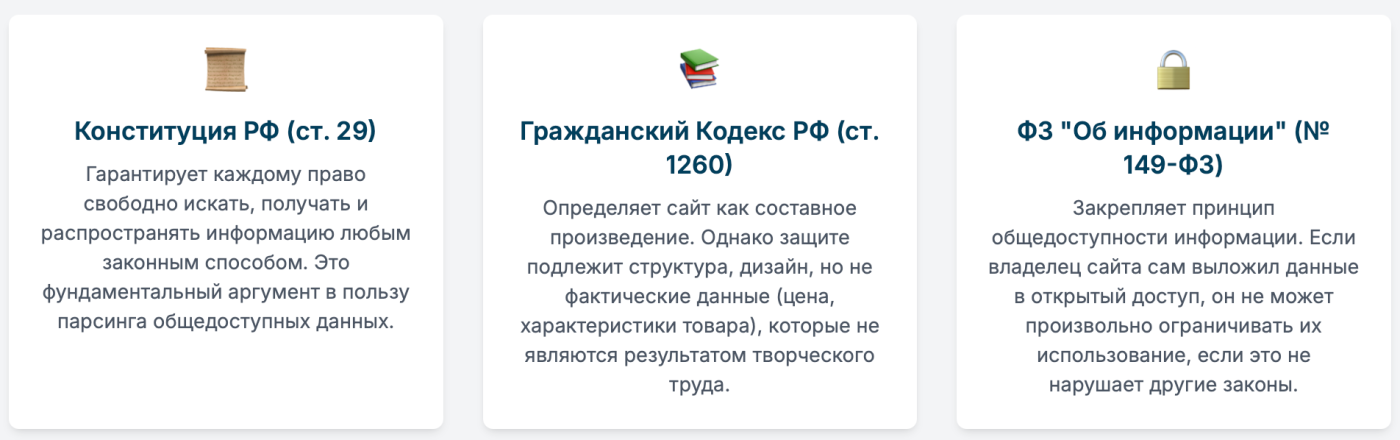 Самое главное, что нужно понять: в российском законодательстве нет прямого запрета на парсинг как на технологию или процесс. Сбор информации, которая находится в открытом, общедоступном доступе, сам по себе не является правонарушением.6