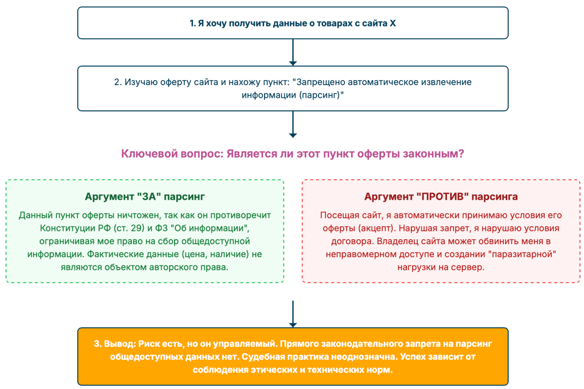 Ответ: В большинстве случаев — можно, при условии, что вы делаете это грамотно. Сам по себе запрет в оферте является «договором присоединения», и его условия можно оспорить как «явно обременительные», если они ограничивают ваше законное право на сбор общедоступной фактической информации. Главное — не нарушать другие, более серьезные законы: об авторском праве (особенно на базу данных), о персональных данных и не создавать чрезмерную нагрузку на сайт. Запрет в оферте — это скорее сигнал о том, что владелец сайта не хочет, чтобы его парсили, но это не абсолютный юридический барьер.