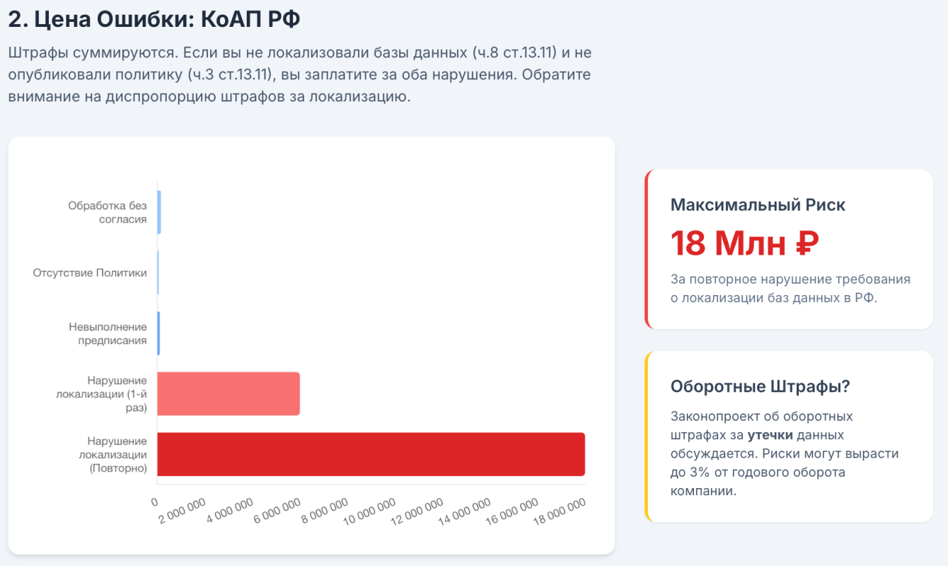 | Утечка данных (повторная) | фикс. штраф | Оборотный штраф: 1-3% выручки (20-500 млн руб.) 1 |
