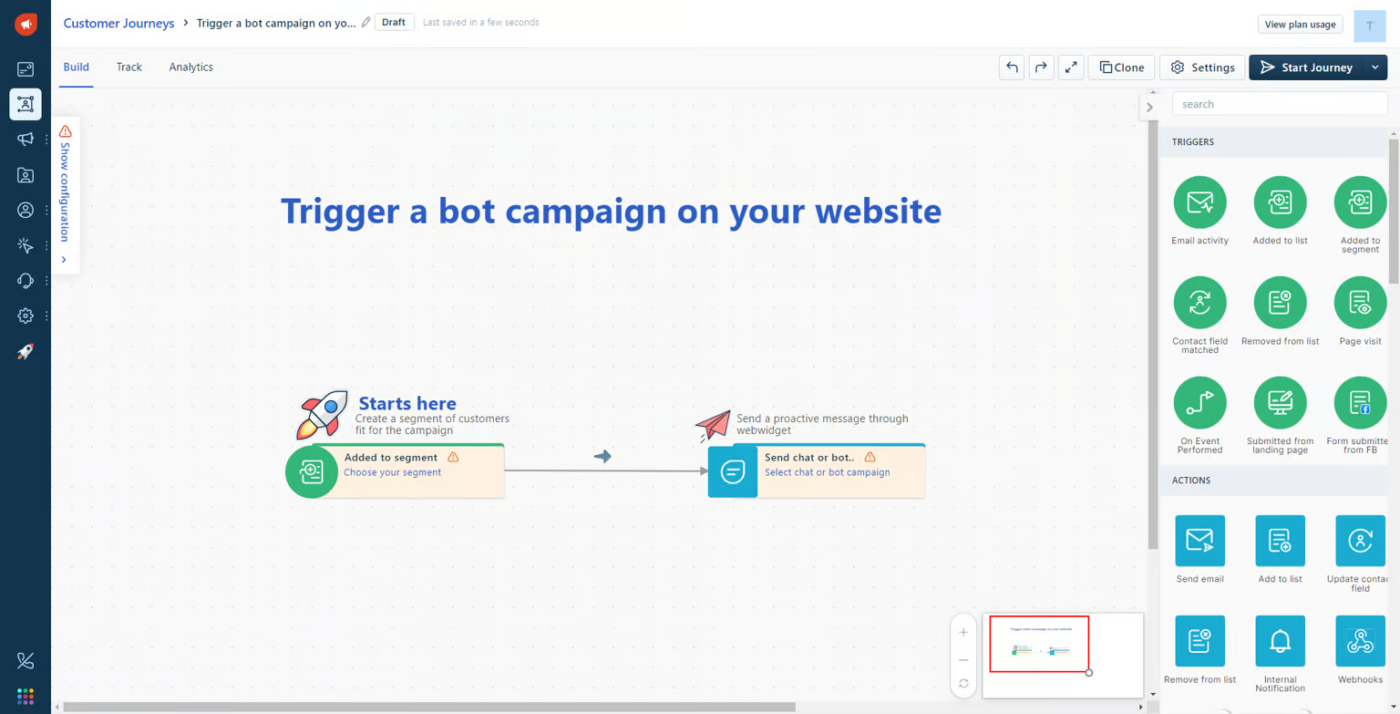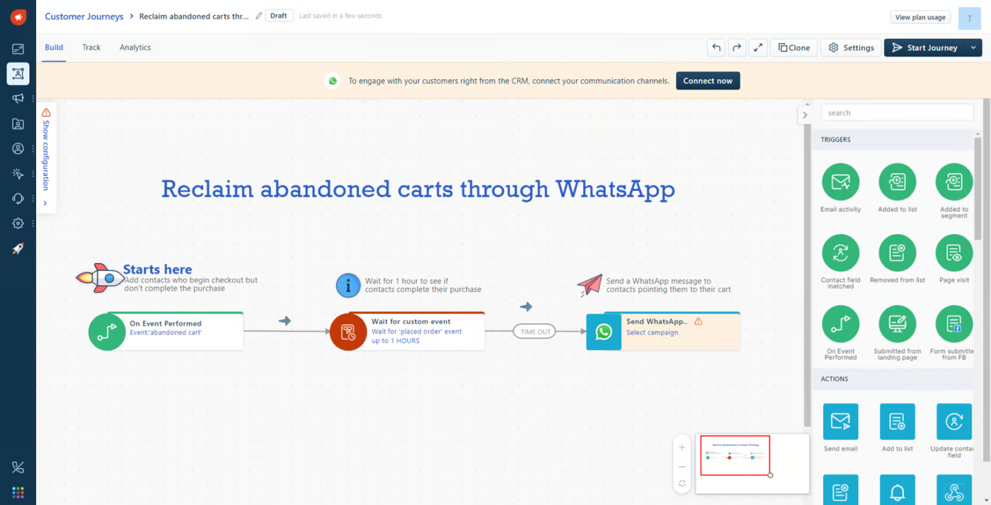 Когда лид или клиент переходит по URL-адресу и покупает что-либо на вашей торговой площадке, отправьте автоматические транзакционные электронные письма, чтобы доставить важный контент непосредственно в почтовые ящики клиентов или в их учетные записи WhatsApp. Вы можете воспользоваться следующими средствами автоматизации кампаний: