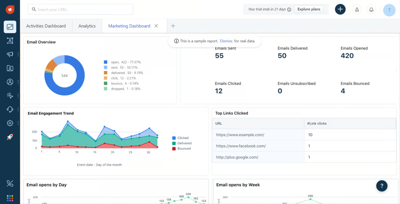 Freshmarketer предлагает множество панелей, таких как панель действий, панель аналитики, панель маркетинга, панель продуктов и панель эффективности маркетинговых каналов. Напротив, большинство альтернатив Freshmarketer сосредоточены на маркетинге электронной почты и предлагают только панель для него.