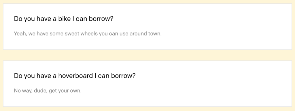 Голос очень неформальный. Они говорят «да» вместо «да». Они используют другие фразы, такие как «милые колеса» и «чувак». На странице даже присутствует немного юмора в вопросе об одалживании ховерборда. Этот фирменный стиль звучит и на странице FAQ; вот еще несколько примеров.
