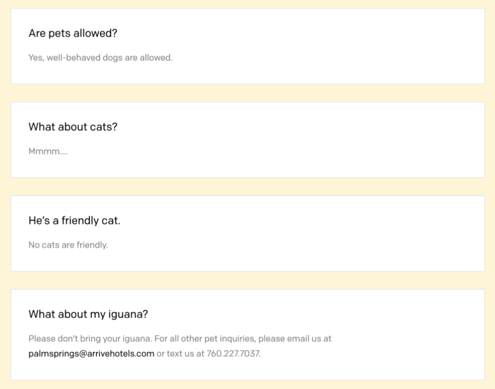 Опять же, это неформальный и шутливый способ сказать, что собаки в отеле разрешены, но другие домашние животные не допускаются. Бренд не стремится понравиться всем. Будучи бутиковым и модным отелем в Палм-Спрингс, Калифорния, ARRIVE ориентируется на молодых взрослых, которые хотят остановиться в стильном месте. Они не ориентированы на семьи, бабушек и дедушек. Компании, продающие доски для серфинга, не будут иметь тот же голос бренда, что и юридическая фирма. B2B-компании, продающие корпоративные SaaS, не должны иметь тот же голос бренда, что и ритейлер, продающий одежду для девочек-подростков.