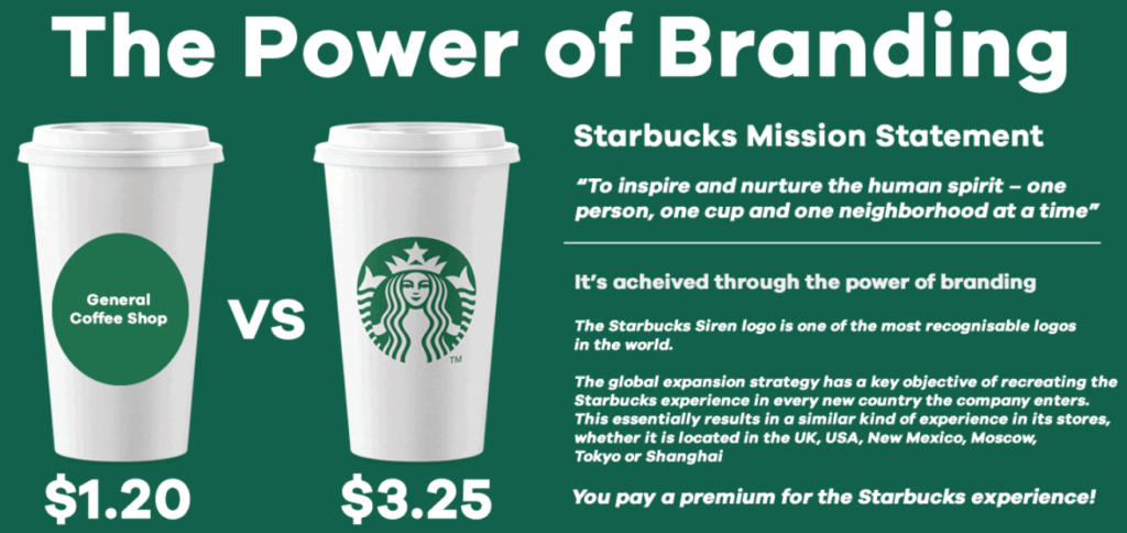 Почему люди готовы платить такие высокие цены за простую чашку кофе? Брендинг. Где бы вы ни находились — в Лос-Анджелесе, Нью-Йорке, Париже или Риме, — заходя в Starbucks, вы точно знаете, что получите. Вы можете получить большую чашку кофе за меньшую цену на заправке или в небольшой местной пончиковой, но эти заведения не обладают такой силой брендинга, как Starbucks. Посмотрите на заявление о миссии Starbucks на картинке выше. «Вдохновлять и воспитывать человеческий дух — по одному человеку, одной чашке и одному району за раз». Starbucks не продает кофе, они продают чувство — они продают бренд. Gucci продает футболки по 500 долларов. Apple продает телефоны за 1000 долларов. Nike продает кроссовки за 250 долларов. Почему эта рубашка стоит больше, чем рубашка за 5 долларов? Почему iPhone стоит намного больше, чем смартфон за 100 долларов? Действительно ли Nikes стоят в пять раз больше, чем обычные кроссовки? Вот почему так важно приложить усилия для создания бренда.